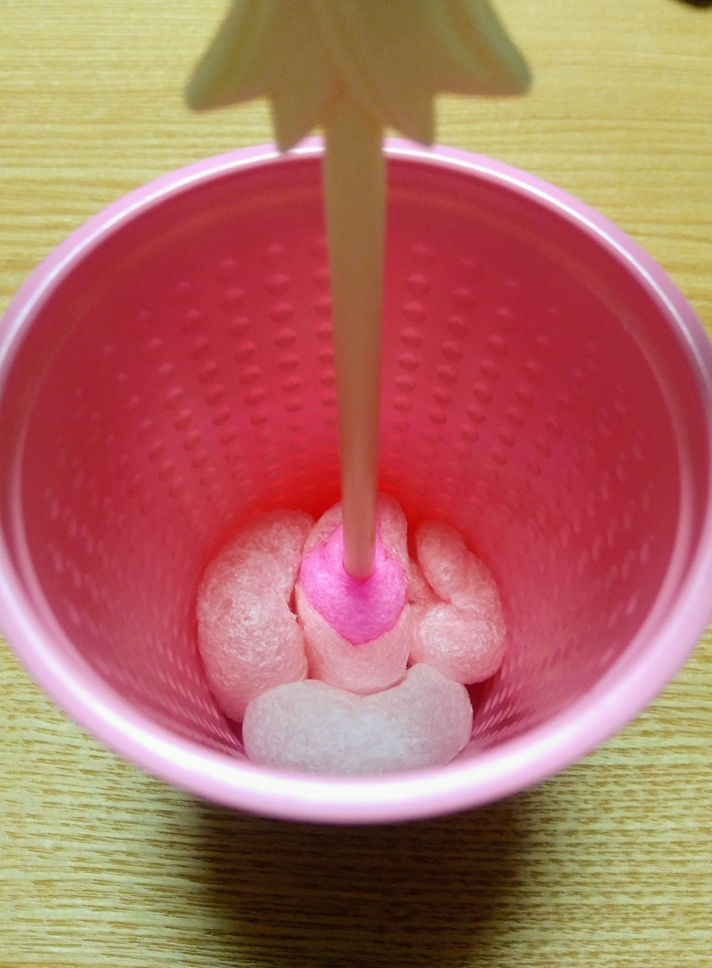 プラコップにハートの緩衝材をぎゅうぎゅうに詰め込みます。