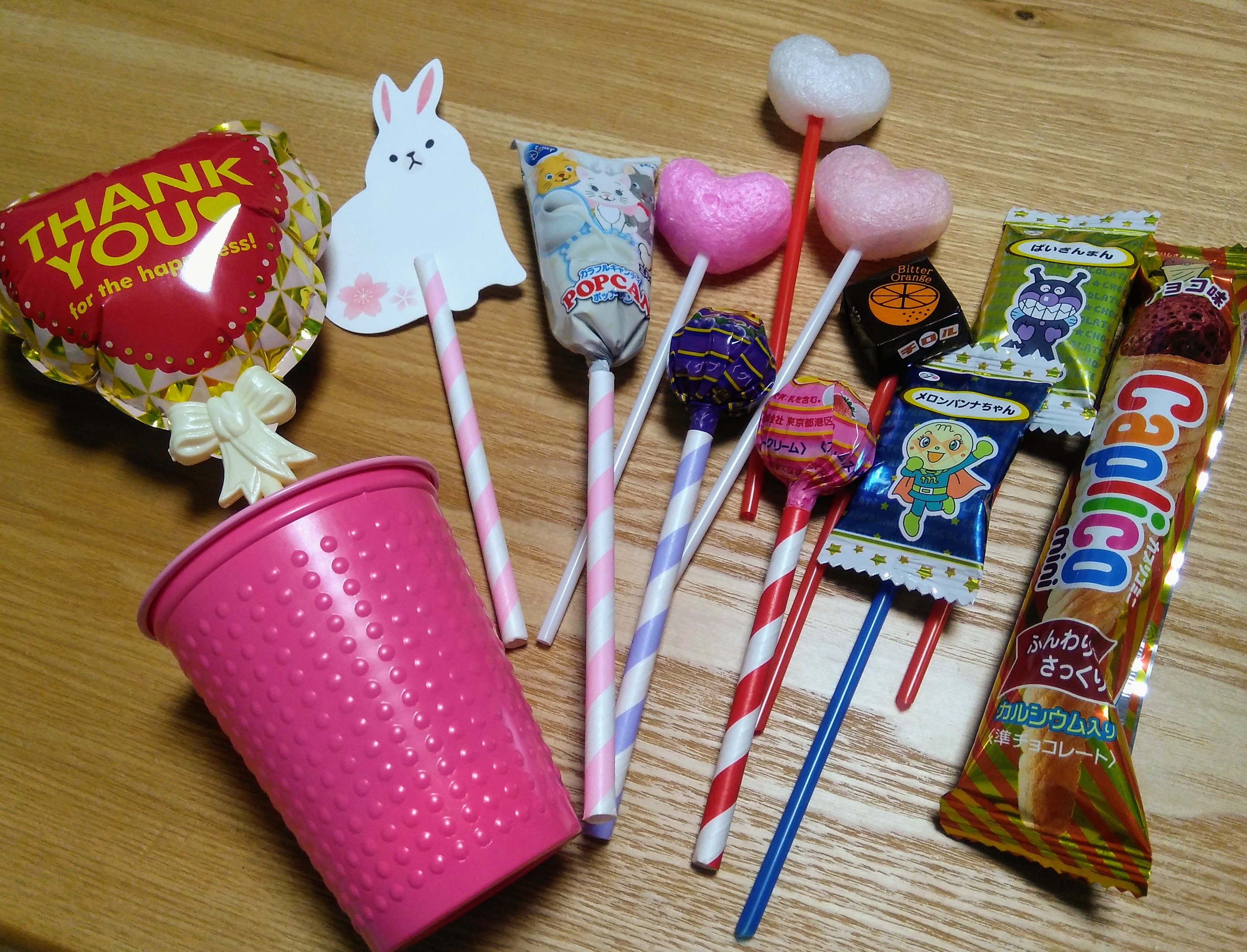 カップや単品の棒キャンディの色を同じ色味にすれば統一感も出ますよ~。