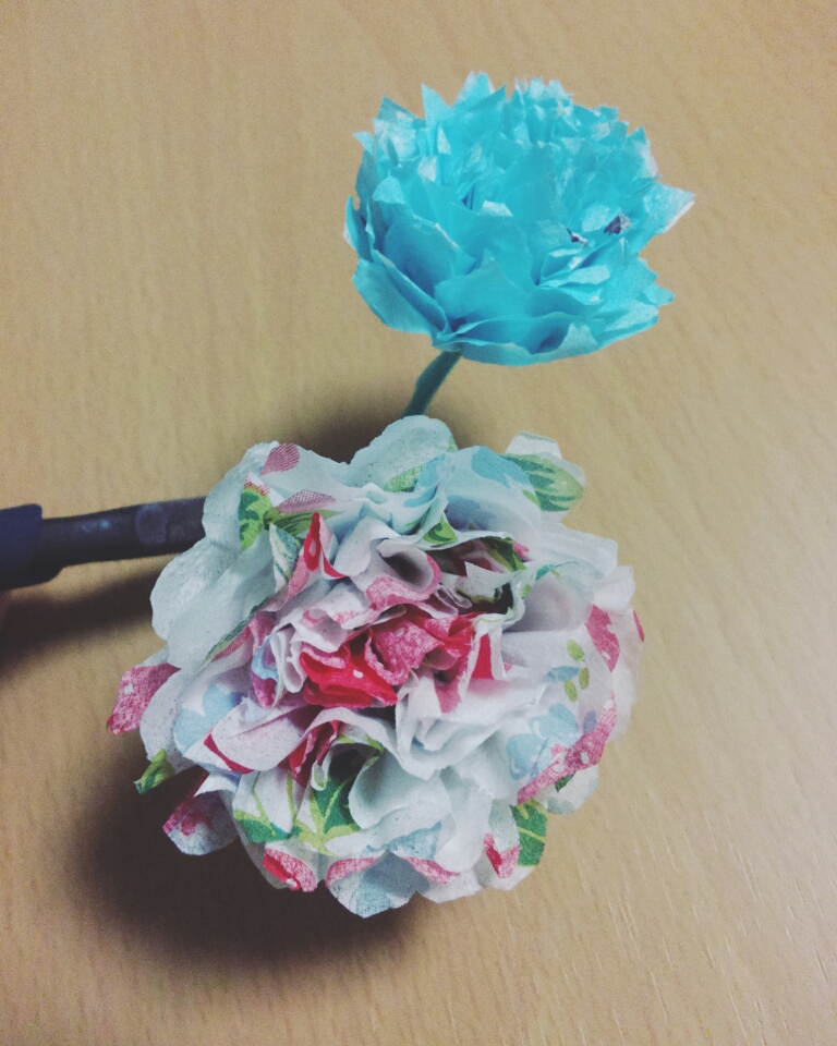 最後に不織布(花材問屋さんにてバルーンとリボンと購入)でブーケぽく包んだら、リボンでしっかり結ぶ。